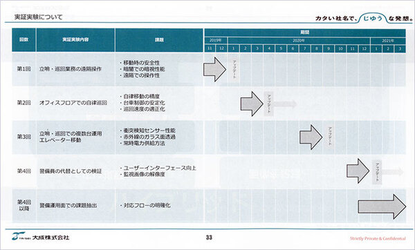 今年度の導入目標は20台以上。翌年からは50台以上の導入を目指す。競合のSEQSENSE社が1年半で10台の導入実績を2021年4月に発表していることから、それを上回る目標数となる。また、当初は大成が警備業務を受託しているクライアントを中心に導入を進めるが、既に他の警備会社からの問い合わせもあるため、他社への導入も順次進めていく考えだ。