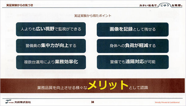 実証実験から「人より広い視野で監視できる」「警備員の集中力が向上する」「複数台運用による業務効率化」「画像を記録として残せる」「スタッフの身体への負荷が軽減する」「警備でも遠隔対応が可能」という利点を確認することができたという。