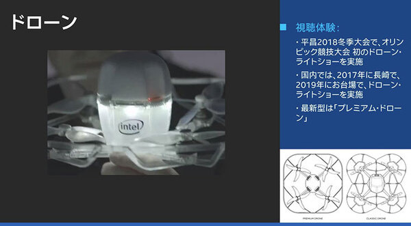 「平昌2018冬季オリンピック」でも話題になった1,200台以上のドローンを飛行させたドローン・ライトショーを記憶している読者も多いだろう。あれもインテルの提供によるもの。その後、日本国内では、2017年夏に長崎のテーマパークで300台、そして2019年には第46回東京モーターショー2019で、合計500台のインテル Shooting Star ドローンによるドローン・ライトショーを提供してきた。それが再び、グレードアップして演習に加わえられることになっている。楽しみだ。