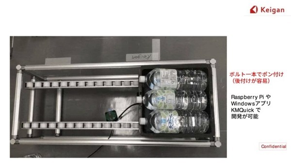 具体的には工場内で用いるAGVキット、そして搬送ローラーキットである。自動車工場などには「カラクリ」と呼ばれる基本的には無動力の仕掛けが多くあり、主に工程間で箱やパレットを運ぶために使われている。だが、ちょっと動力が欲しいときもある。そこでローラーコンベア、コロコンコンベアにワンタッチで取り付けて動力化できるKeiganモーターに目をつけたユーザーが大手自動車メーカーにいた。