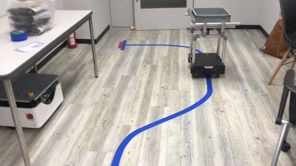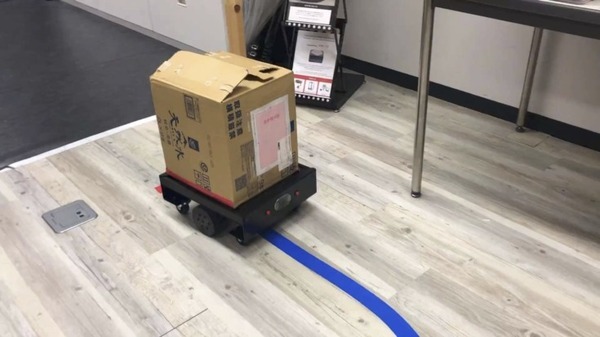また、カメラを使ったライントレース(床面のライン追従)走行も可能。磁気式テープに比べると安価なラインテープですむので初期投資を下げることができるとしている。なお途中までガイドレスで移動し、途中からガイドテープを使ってより高精度に動かすといったこともできる。