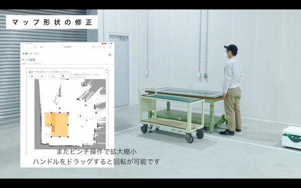 マッピングはロボットを人がタブレットからリモート操作して行う。操作のためのウェブアプリは本体にあってWi-Fiで接続して用いる。「スマホアプリが使える人」なら使えるという。マップ作成ボタンを押すとタブレット上でロボットが操作できるようになるので、ロボットを動作範囲で動かしていく。最後はマップ名をつけて保存し、そのあとに「タスクセット」という画面でロボットの動作(Keiganモーターに与える命令のセット)を設定していく。