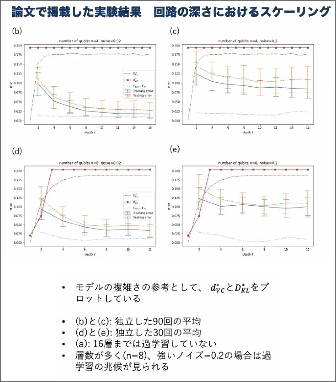 量子コンピュータは従来コンピュータとは全く異なる性質で動くため、従来コンピュータ上で成り立つ性質が、量子コンピュータでも同様に成立するのか、それとも異なる性質を持つのかが、詳細には解明されていない。そのためこの研究では、様々な量子アルゴリズムで採用されている汎用的な量子回路について、量子ビットの数と量子回路の深さなどがモデルの表現力と過学習にどう影響するかを研究した。その結果、量子回路の深さを増加させ(従来のニューラルネットワークを多層にすることに対応)パラメータを増加させると、ある地点でモデルの表現力が飽和することを、様々な数値実験で見いだしたという。モデルの表現力が飽和するということは、回路パラメータを増加させても、それ以上モデルが複雑化せず、結果、過学習が起きない事を意味する。さらに、この事実の理論保証を与えるため、モデルの複雑性の指標であるVC次元※1が上限値をもつことを証明した。このことは、訓練誤差と汎化誤差の差分の拡大が進まないことを意味し、つまり量子回路は過学習しにくいことを示す、と結論づけた。
