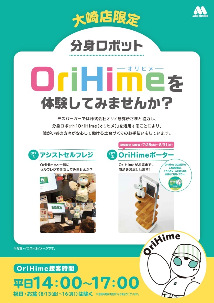 今回の実験ではモスバーガー大崎店にて時間限定(平日14:00~17:00)で「OriHime Porter」を1台設置。大崎店内の「OriHime 専用席」に着席した利用者に対し、フードメニューを「OriHime Porter」が運搬する。OriHime Porterに設置したタブレット端末にパイロットのプロフィールを案内掲示することで、利用者とパイロットのスムーズな会話を促す。期間は2021年7月28日(水)~8月31日(火)の1か月間で、10名のパイロットが担当する予定。