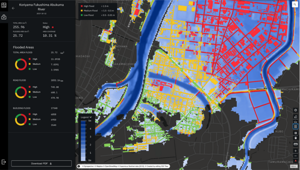 Synspectiveでは、昨年、水災害対応のための浸水被害(浸水域、浸水深、被害道路、被害建物)評価する「Flood Damage Assessment(浸水被害モニタリング)」サービスを提供(下図)。水災害時において広範な地域の被害状況を一次情報に基づいて把握することができる本サービスは、迅速な意思決定への貢献が期待されている。今回は、Synspective、佐賀県庁、株式会社島内エンジニアおよびJAXAの連携により、小型SAR衛星コンステレーションの活用による、豪雨による浸水被害の解析精度の向上を実証する。