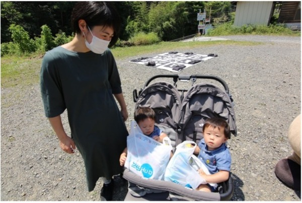 7月20日の当日は晴天、小菅村に住む小山さん一家へ商品を積んだドローンが飛行。着陸地点には『モラタメ』公式キャラクター「ポッケ」が待機し、小山さんに商品を手渡した。小山さんは小さい子どもの育児もし、普段の買い物では手に入らない・買いづらい商品も多かったという。欲しかった商品でいっぱいの箱を開け、「嬉しいです!」とコメントをした。