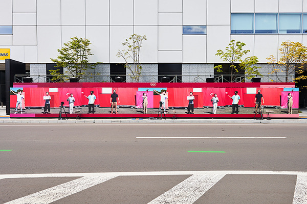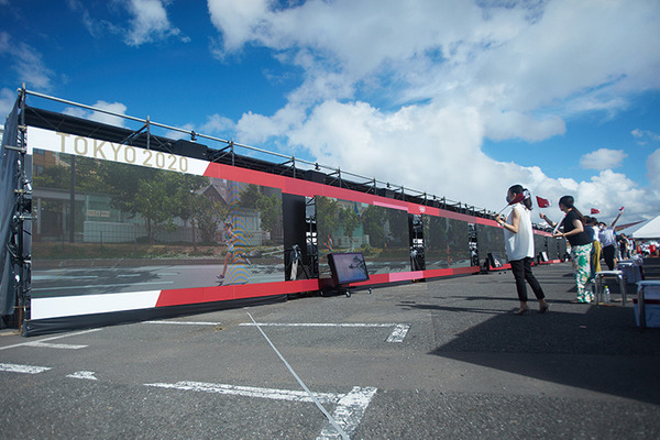 そして、今回のプロジェクトでは、マラソンの迫力を伝えるために、札幌のマラソンコースと、東京の東京 2020 リアルタイムリモート応援プロジェクトの会場の両拠点に設置された8台のカメラで映像を収録、それらの映像を通じて相互の様子をリアルサイズで表示することを可能とする幅約50mの巨大なLEDディスプレイを設置した。
