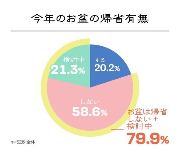 また、今年のお盆の帰省について質問したところ、「帰省しない」が58.6%、「検討中」が21.3%と、約8割が帰省しない決断をしたか、お盆まで一ヶ月を切るタイミングになっても帰省について悩んでおり、まだまだ帰省しにくい日々が続いている様子が見て取れる。