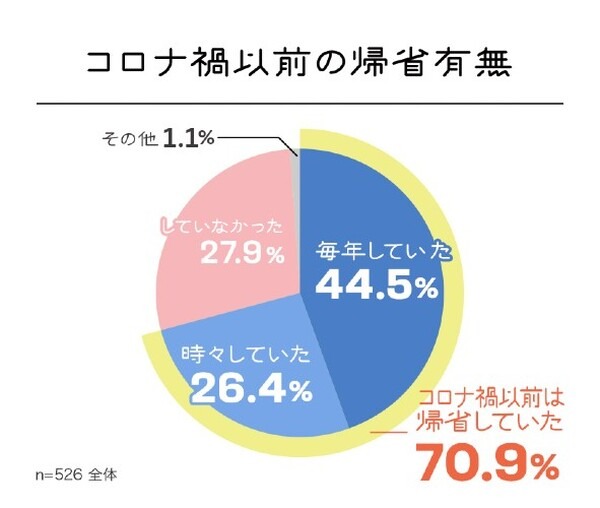 なお、コロナ禍以前はお盆の帰省を「毎年していた」が44.5%、「ときどきしていた」が26.4%と、約7割の人が帰省していたことからも、コロナ禍で親と会う機会が激減していることがわかる。