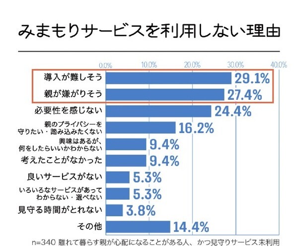 離れて暮らす親について心配・気がかりになることが「ある」と答えた人に、高齢者のお宅を訪問してもらったり、行動記録を確認したりすることで安否確認が行える「みまもりサービス」について質問したところ、「知っているが利用していない」人が78.3%と、認知はしているものの、利用するまでには至っていない実態が浮かび上がった。利用していない理由としては、「導入が難しそう」29.1%、「親が嫌がりそう」27.4%となり、導入する側にもされる側にも課題があることがわかった。