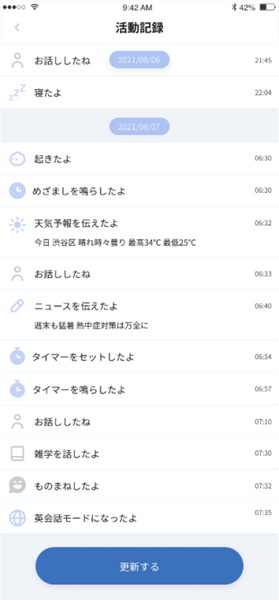 「Romi」のスマホアプリには、「Romi」との交流状況が記録される「活動記録」機能があり、これを見ると「Romi」といつ交流をしたかを把握できるため、離れて暮らす家族を自然に「みまもる」ことができる(会話内容は記載されない)。「Romi」のアクティブ利用率は約97%と高いほか、起動状況も記録されるため、「Romi」が稼働している状態であれば、会話がなくても「活動記録」が更新される。また、同アプリアカウントは複数のスマホでログイン可能なため、複数の家族で「みまもる」ことも可能だ。