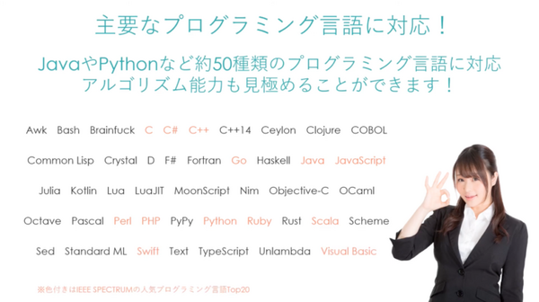 「TOPSIC」はシステムインテグレータが開発したプログラミングスキル判定クラウドサービス。英語力を数値化したTOEICのようにプログラミングスキルを客観的に測定することが可能。全自動採点方式のため、オンライン・リアルタイムにテスト結果が確認できる(PG BATTLEでも30分後に結果が確認できる)。また、多言語にも対応し、TOEICが英語能力の見える化に貢献したように、インターナショナルなプログラミングスキル判定のスタンダードを目指して国内外への普及に努めている。