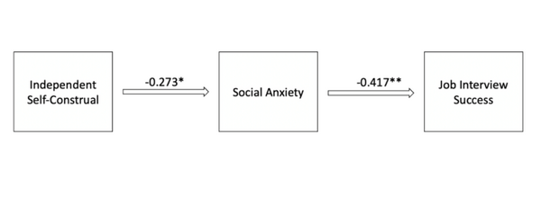 対人不安(Social Anxiety)が大きいと面接評価にネガティブな影響がある。相互独立的自己感(Independent Self-Construal)の強さが社会不安を減少させ、面談評価を上昇させるモデルが観察された。一見「おびえた」感情の観測と面談評価との関連と矛盾するが、特定の話題における不安や「おびえ」は表明し自己開示を表現しつつも、面談担当者を対象としてそれら感情を表明しないことがポイントかもしれない。