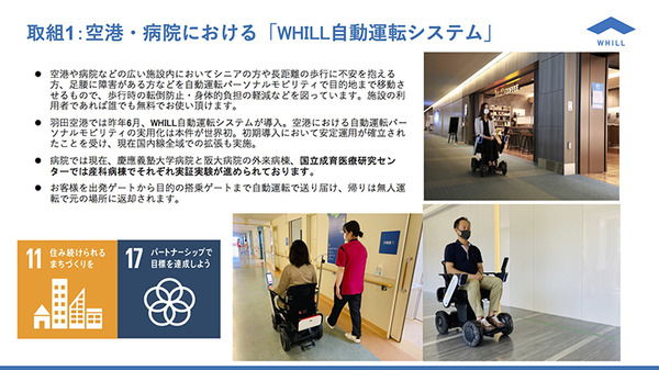 そしてWHILLによる4つの取り組みを紹介した。まず、空港・病院における「WHILL自動運転システム」は、羽田空港で実用化され、慶應義塾大学病院ほかで実証実験が進められている。目的地までは人を自動で運び、到着後はモビリティが自動でステーションに帰る。