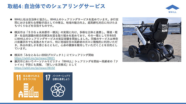 4つ目は自治体でのシェアリングサービスだ。SDGs未来都市でもある横浜市や、藤沢市では、WHILLを地域在住の高齢者に対して新たな移動手段として提案している。