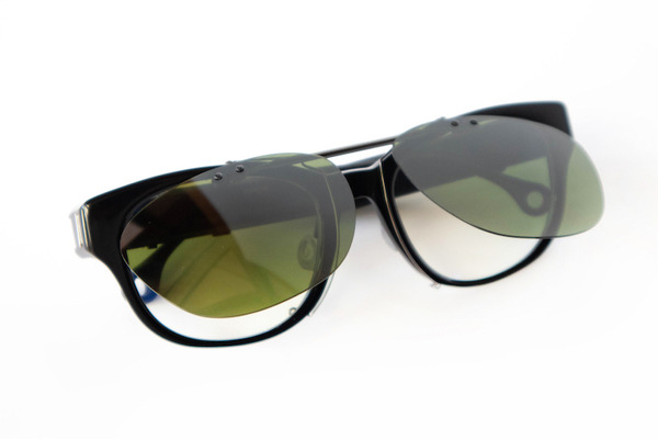 いつでもお使いのメガネがサングラスになる「クリップ式サングラス」が付いたセットも用意。三段階の角度に調整でき、付け外しも簡単。普段あまりサングラスを付けない人でもクリップ式サングラスならシチュエーションによって付け外しできる。