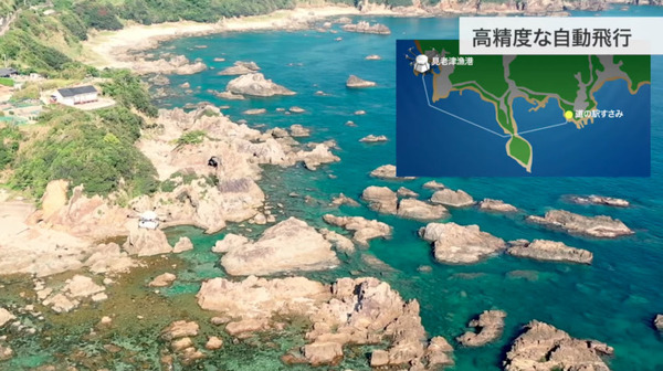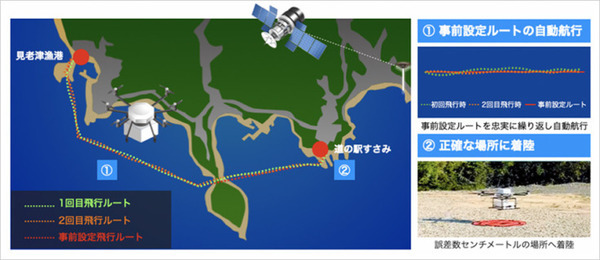 実証実験ではすさみ町の名産品「すさみケンケン鰹」を水揚げした見老津漁港から約3km離れた「道の駅すさみ」まで自動航行のドローンで運搬することで、広域を移動する場合でも高精度に着陸できることを実証した。