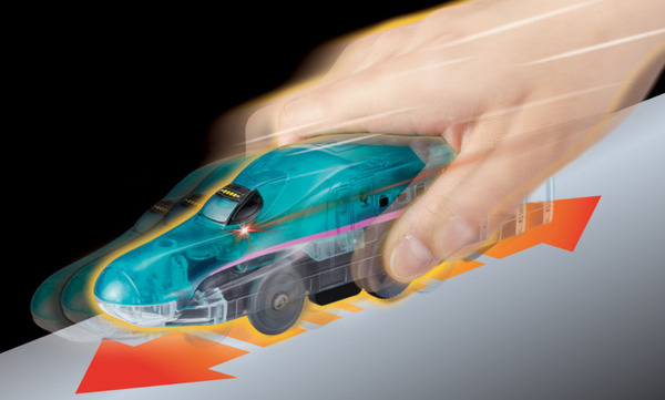 同商品はプラレール62年間の歴史で初の、電池なしで電動走行する車両。車体を床やテーブルの上などで前後に転がして車輪を回転させることで発電する仕組みで、約30秒間チャージすることで約7m(正円に組んだレイアウト約5~6周分)、電池を使うことなく電動走行することができる。