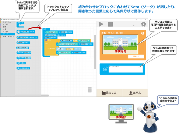 ゼッタリンクスが開発したプログラミング教育ツール「Sotaとはじめるプログラミング」は、ブロックを並べてロボットの動作や会話文をプログラムすることで、プログラミング的思考を学ぶことができる教育ツール。ブロックを組み合わせることでさまざまなロボットの動作や会話をプログラムすることができ、ロボットが聞き取った言葉をもとに条件分岐を行うことも可能。また、ロボットの話す言葉や動作に合わせてパソコン画面に写真や画像を表示させることができる。