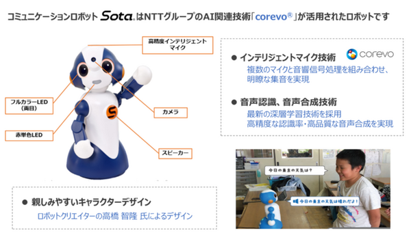「Sota」(ソータ)はNTT東日本が展開するクラウド型ロボットプラットフォームサービス「ロボコネクト」に対応したヴイストン社製のコミュニケーションロボット。インテリジェントマイク技術により明瞭な集音が可能で、人との会話をスムーズに行うことができ、多言語対応オプションで英語による会話も可能。また、人と同じように身振り手振りを使ってコミュニケーションを行うことができ、ホテルの受付や観光案内などの実際のビジネスの現場で活躍している。