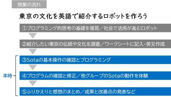 今回の実証授業ではプログラミングと英語に加え「東京の伝統・文化」指導を盛り込み、教科横断型学習を行う。始めに地元地域の上野周辺にある東京の伝統・文化を象徴する建造物や観光名所などについて調べ学習を行い、海外から来た人に紹介したい内容を日本語で纏める。続いて、伝えたい内容を英語で表現しやすくするために、日本語で考えた文章をよりシンプルにしてから英語に翻訳。その後、生活や社会を支える情報技術の基本的な仕組みを理解し、コミュニケーションロボットが東京の文化を正確にかつ分かりやすく外国の人に伝えるために、双方向性のあるコミュニケーションとなるように会話文・動きを考え、各グループでプログラミングする。