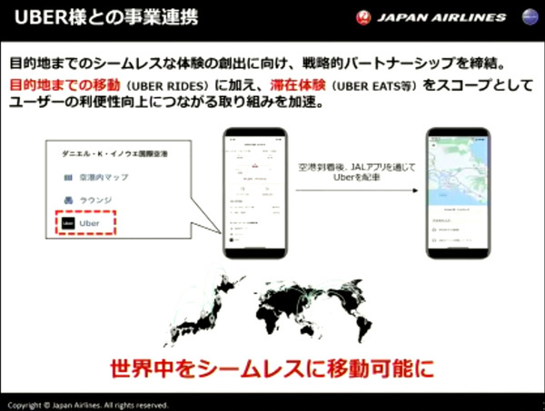 JALとUber Japanは戦略的パートナーシップを締結し、アプリを通じて航空を軸としてUBER RIDESと連携したシームレスな目的地まで移動をアプリで提供しているという。また、UBER RIDESだけでなく、デリバリーのUBER EATSによる滞在体験も含めて提供しているこしを紹介した。
