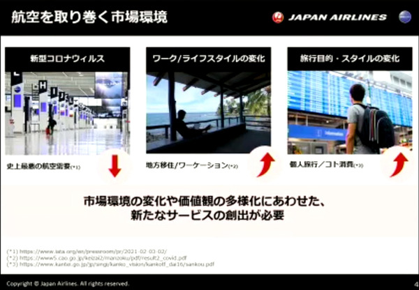 コロナ禍で航空を取り巻く市場環境はとても厳しく、乗客数は国際線で9割減(国内線は約6割減)、史上最悪と言える航空需要だとした。