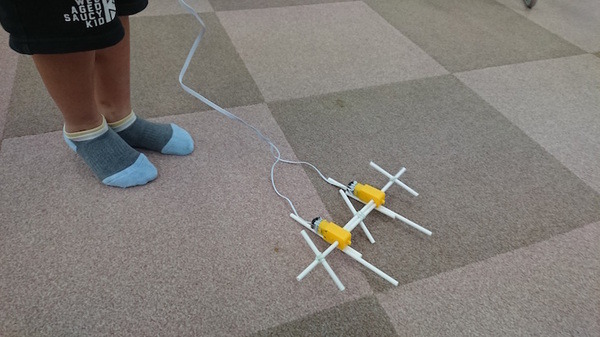 「小学生ロボコン工作教室」が行われた7月27日の当日は千曲市内の小学生6名が参加し、長野高専 電気電子工学科教員の指導のもと、紙ストローと輪ゴムだけでロボットの本体作り、モーターで動作させるロボットの基本的な作り方について学んだ後、足の数やモーターの取り付け位置を変えるなど、自分だけのオリジナルロボット製作に取り組んだ。