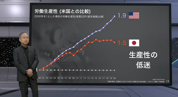 孫正義氏は、かつて世界の経済を牽引した日本が、低迷する労働力と生産性の低下について触れ、失われた競争力を再び取り戻す復活の鍵は何か、減りゆく労働人口の問題をどのように解決できるのか、日本の成長戦略等について語った。