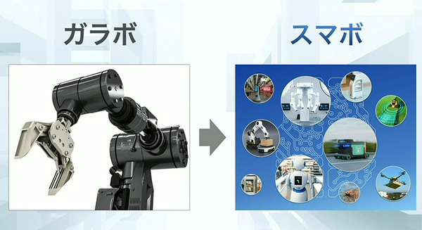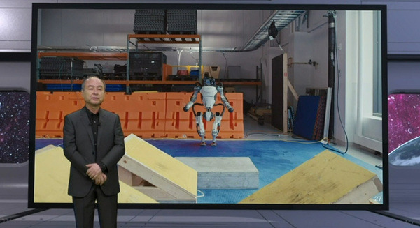ボストンダイナミクスの人型ロボットの「Atlas」(アトラス)がパルクールを行う映像を紹介し、その身体能力を高く評価したあと、物流倉庫で働く「Stretch」(ストレッチ)の動画を観ながら「自分で学習しながら臨機応変に対応していくところが素晴らしい。それがガラボとスマボの違い」と語った。
