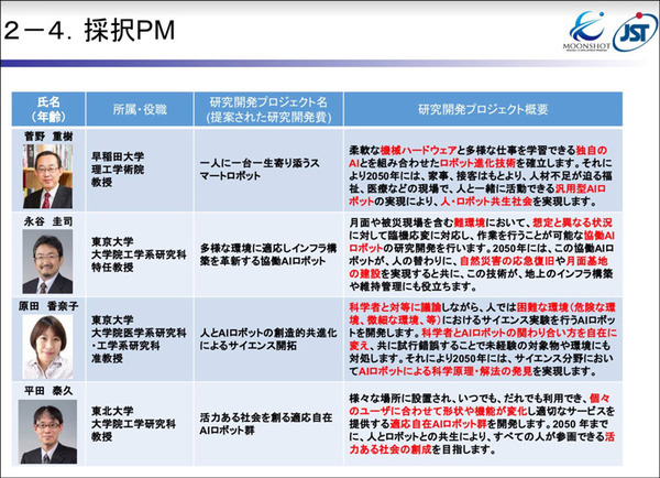 これに対して、それぞれバックキャストして、今から何をするべきかが検討されて、4つの研究開発プロジェクトが採択されている。ここでは、4人のプロジェクトマネージャー(PM)による講演をまとめてレポートする。