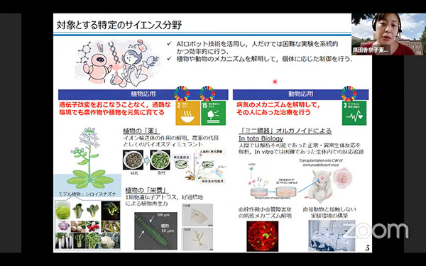 東京大学大学院工学系研究科 准教授の原田香奈子氏らは、自動でサイエンスを探求する自律型AIロボットの開発に挑んでいる。AIロボット科学者と科学は、同じ型の循環により試行錯誤しながら進展しているという。求める結果に仮説を立て、実験方法を立案し、観察し、そのなかの構造を発見する。これが理論発見になるし、AIロボットの戦略獲得になる。ロボットを使うことで単に観察するだけではなく、意図的に対象に操作を加えることがメリットだという。