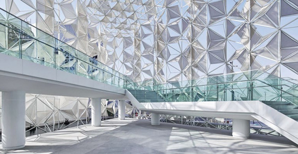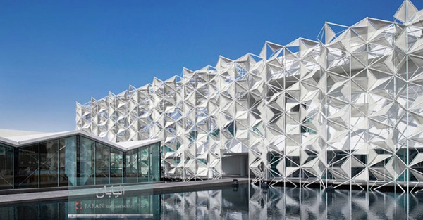 特徴的なファサード・デザインの日本館は永山祐子さんが主導。アラベスクと日本の折り紙を組み合わせたもので、日本と中東の長い歴史のつながりを表現している。また、双方の伝統的な環境システムを取り入れ、水と風を利用した環境にやさしいサスティナブルな建築となっている。