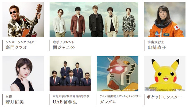 ドバイ万博の日本館には、日本文化を代表する多くのエンタメが参加する。「日本館PRアンバサダー」として、アニメ界からは機動戦士ガンダムとポケットモンスター(ピカチュウ)、歌手やタレントからは嘉門タツオさん、関ジャニ∞、若月佑美、宇宙飛行士の山崎直子さん、東海大学付属高輪台高等学校 UAE留学生の皆さんが担当している。