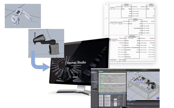 「Sysmac Studio 3Dシミュレーション」は2020年にオムロン発売したシミュレータで、ロボットを含む豊富な制御機器群の技術を活用することで工場設備全体をデジタル上で再現し、実機と同等の精度で動作を検証できるシミュレーションソフトウェア。