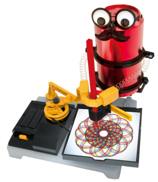 空きカンボディーのロボットが体を前後に揺らしながら、回転するトレイ上の紙になめらかな曲線で模様を描く。ペンを取り付けるアームの長さや、ペンの色を変えてオリジナル曲線アート作品に挑戦できる。参考価格3,190円(税込)。