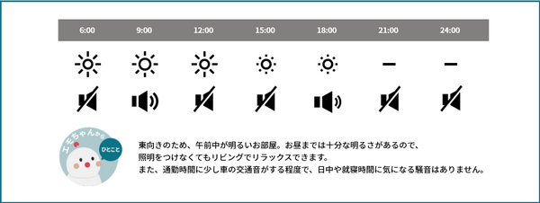 一日の中でも時間帯によって大きく変化する日当たり。「BOCCO emo」のセンサ機能により、一日のお部屋の明るさを24時間計測しサイト上の物件紹介ページに掲示する。時間帯ごとに5段階のアイコンで表示する。