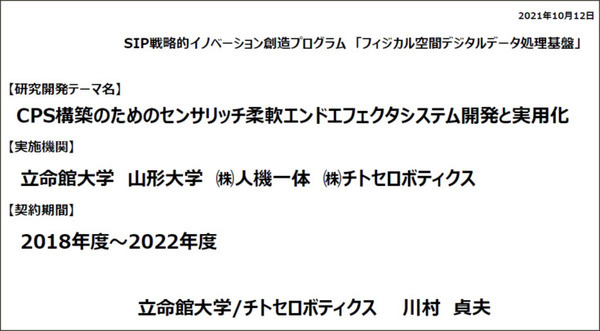 立命館大学は、理工学部 川村貞夫教授が研究責任者を務める研究プロジェクト「CPS構築のためのセンサリッチ柔軟エンドエフェクタシステムの開発と実用化」について、報道関係者向けに説明会を開催した。