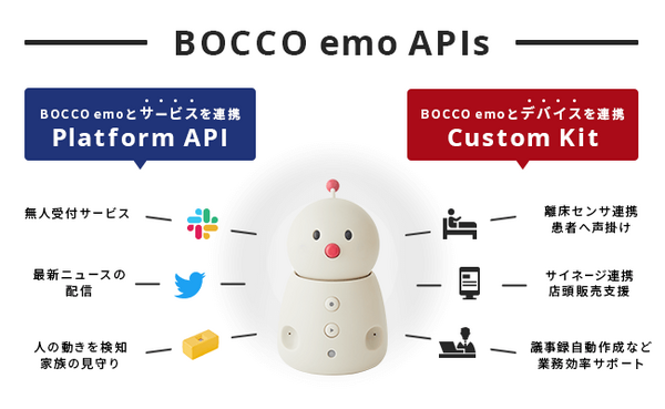 ユカイ工学株式会社はコミュニケーションロボット「BOCCO emo」(ボッコ エモ)のロボティクス技術を身近なサービスに活用できるAPI「BOCCO emo APIs」(ボッコ エモ エーピーアイズ)の提供を2021年10月18日(月)より開始することを発表した。