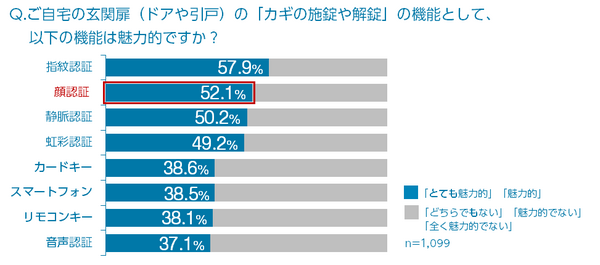 自宅の玄関扉のカギの施解錠機能として、従来の“カギ(手動錠)”以外への意識を調査したところ、「とても魅力的」または「魅力的」と回答した人の割合は、指紋認証や顔認証など“モノ”を使わない生体認証の方が、カードやリモコンなどの“モノ”を使うカギの施解錠機能よりも高い結果になった。また、生体認証として浸透している指紋認証(57.9%)に次いで、顔認証が52.1%と2番目に多く、玄関扉のカギとして人の顔を照合して識別する技術に魅力を感じる人が過半数以上いることが分かった。