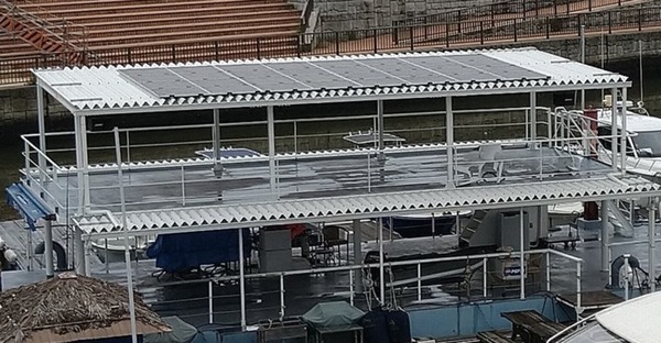 ソーラーパネルによって得られた電力をリチウムイオンバッテリーに蓄電し、必要に応じて船舶への充電を行う。2022年度は風力発電と組み合わせることで、より安定的な電源供給を目指す。