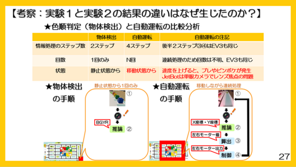 同コンテストには計88チームが参加した。辻さんは「AI ロボット JetBot は WRO を攻略できるか?~AI ロボットを錯覚させてみた~」というテーマのプロジェクトでコンテストに臨んだ。AIロボットの可能性と限界の探究に向けて、CPUベースの従来型教育レゴロボットであるEV3と、教育AIロボットとしてのJetBotを比較している。