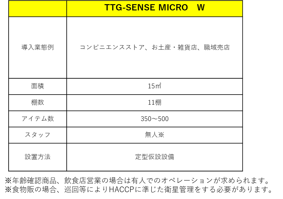 「TTG-SENSE MICRO W」は15㎡程度の極小地での無人決済店舗の展開を可能にする省スペース、ローコストの無人決済店舗システム。コンビニエンスストア、お土産・雑貨店、オフィス(職域売店)等での展開を可能にし、事業者、利用者の双方に利便性を提供できる新たなソリューションとなっている。