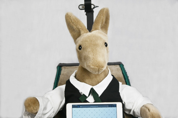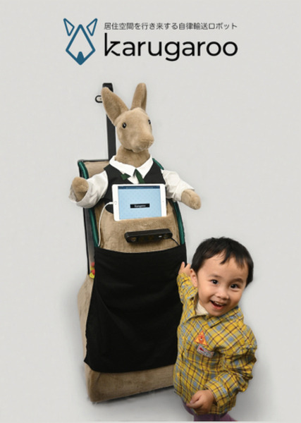 『Karugaroo』はロボサピエンスが開発した自律輸送ロボット。物を輸送するだけでなく、会話をしたりジェスチャーでコミュニケーションを取ったりすることができる。物理的にスイッチなどを押下できるシッポの機構を搭載し、エレベータの乗り降りやインターホンの押下を自律的に行うことができるため、特別な連携をすることなく既存の建物にすぐに導入することが可能。また、ポケットにタブレット端末を装着しているため、バーコードを読み取って商品を購入することができたり、端末に部屋番号を入力すると指定した部屋まで物を自律的に運んだりすることができる。