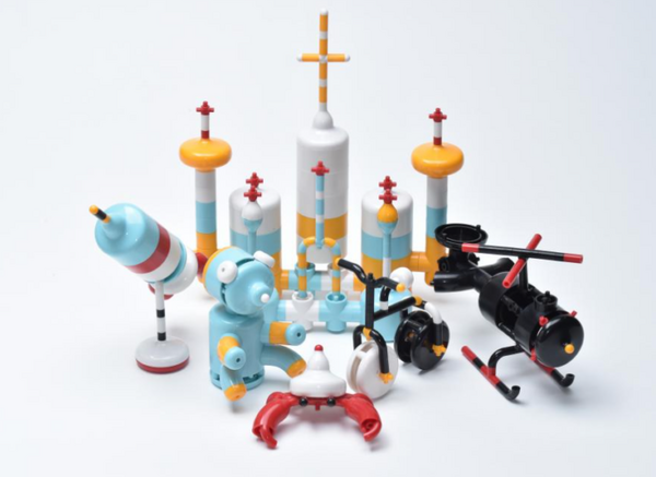チューブロックは配管メーカーが配管の技術を知育玩具にした知育ブロック。配管だからいろんなパーツが繋がりアイデアが形になる。組み立てたあとは作品を動かすこともできる。