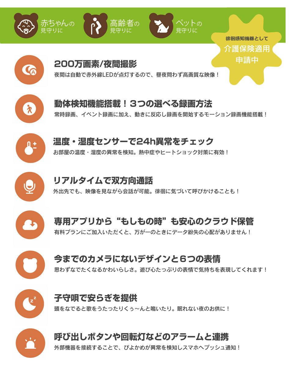 同製品は、モーションセンサーと音声検知センサー、温湿度センサーの3種類のセンサーによる見守りを行う。かわいい見た目だけでなく、表情でもアピール。また、Amazon AlexaやGoogle homeとの連携の他、豊富なオプションとシステム連携が可能だ。