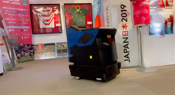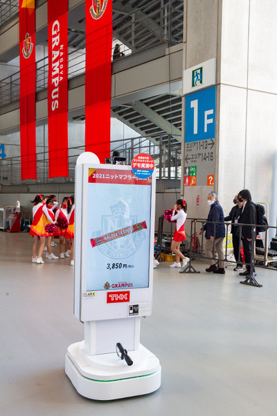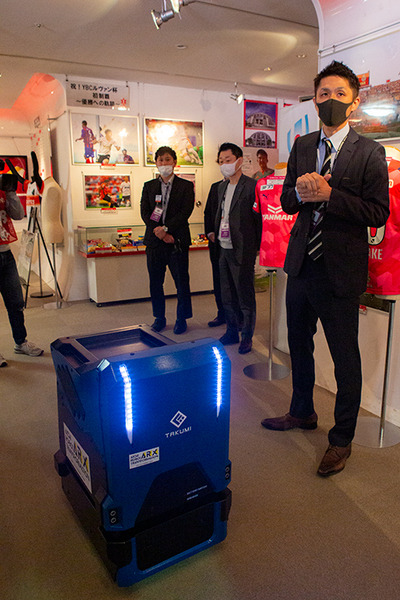 一方、豊田スタジアムの中では、警備、消毒、配膳、商品PR、マーケティング情報収集など、様々な用途向けに開発されたロボット達の実証実験をがおこなわれていた。今回は豊田スタジアムの入場ゲートで来場者を迎える自律移動型の案内ロボット(THK)と、ギャラリーエリアを除菌・脱臭する自律走行ロボット(ナ・デックス)の様子をレポート。