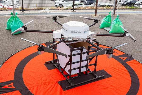 自律飛行ドローンはイームズロボティクスが開発している機体。ソフトバンクのGNSSを活用した高精度測位サービス「ichimill」(イチミル)を活用し、わずか数センチの誤差で飛行、着陸することができる。運べる荷物の重量(ペイロード)は5~9kg