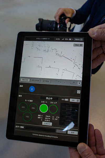 豊田スタジアムのコンコースでは、豊田自動織機が自律モバイルロボット「AiR-T」(エア・ティー)の実証実験をおこなっていた。スタジアム内のお土産店などで、倉庫から店舗まで商品を運ぶ状況を想定して検証をおこなった。