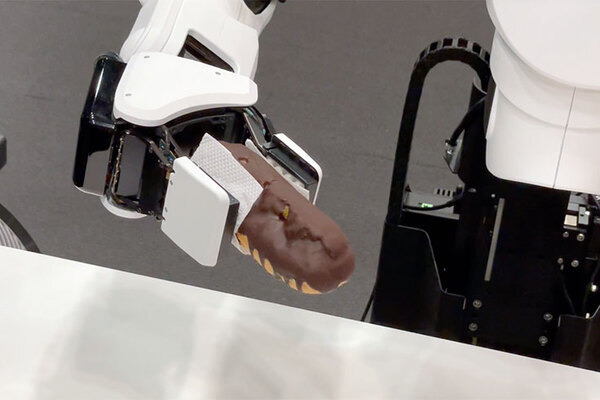人間が柔らかいものをつかむときは、これから持つものを目で見て判断し、柔らかさを予測するが、ロボットはそれらの判断はおこなっていない。物が柔らかいかどうかも知らない。ロボットは指で触れたセンサーで滑らずに持てるチカラでつかんでいるのだが、それが結果的に「優しくつかむ」ことに繋がっている。